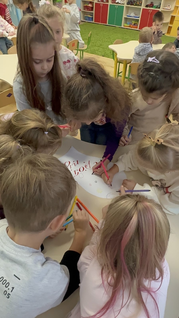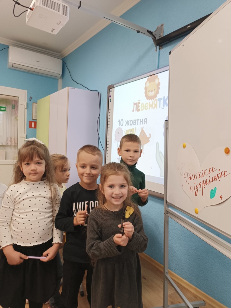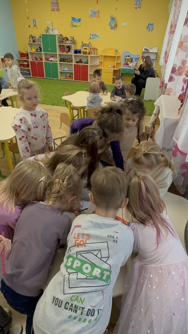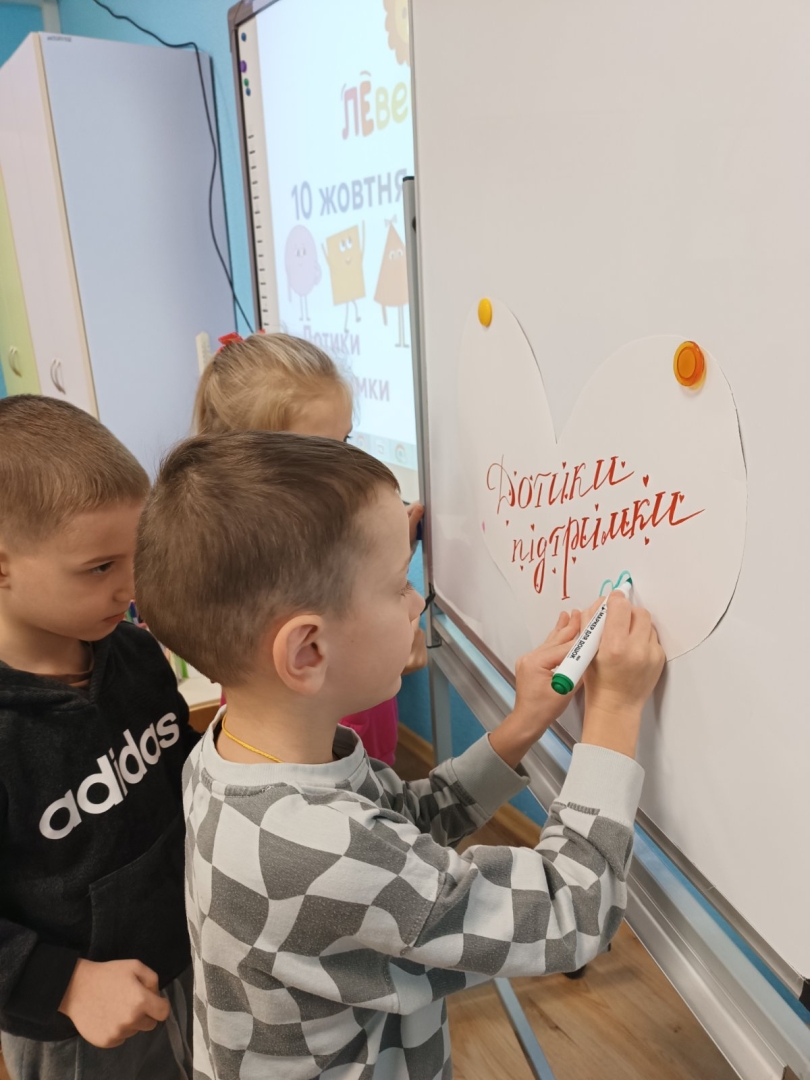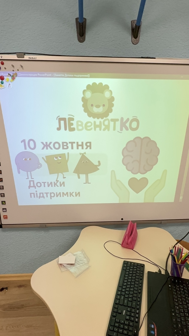 Для дітей старших груп «Перлинка» та «Світлячок» психолог провела інтерактивне заняття «Дотики підтримки», під час якого малята говорили про емоції, вчилися розуміти почуття інших і створювали спільну «Карту підтримки» — символ дружби, доброти й емпатії.